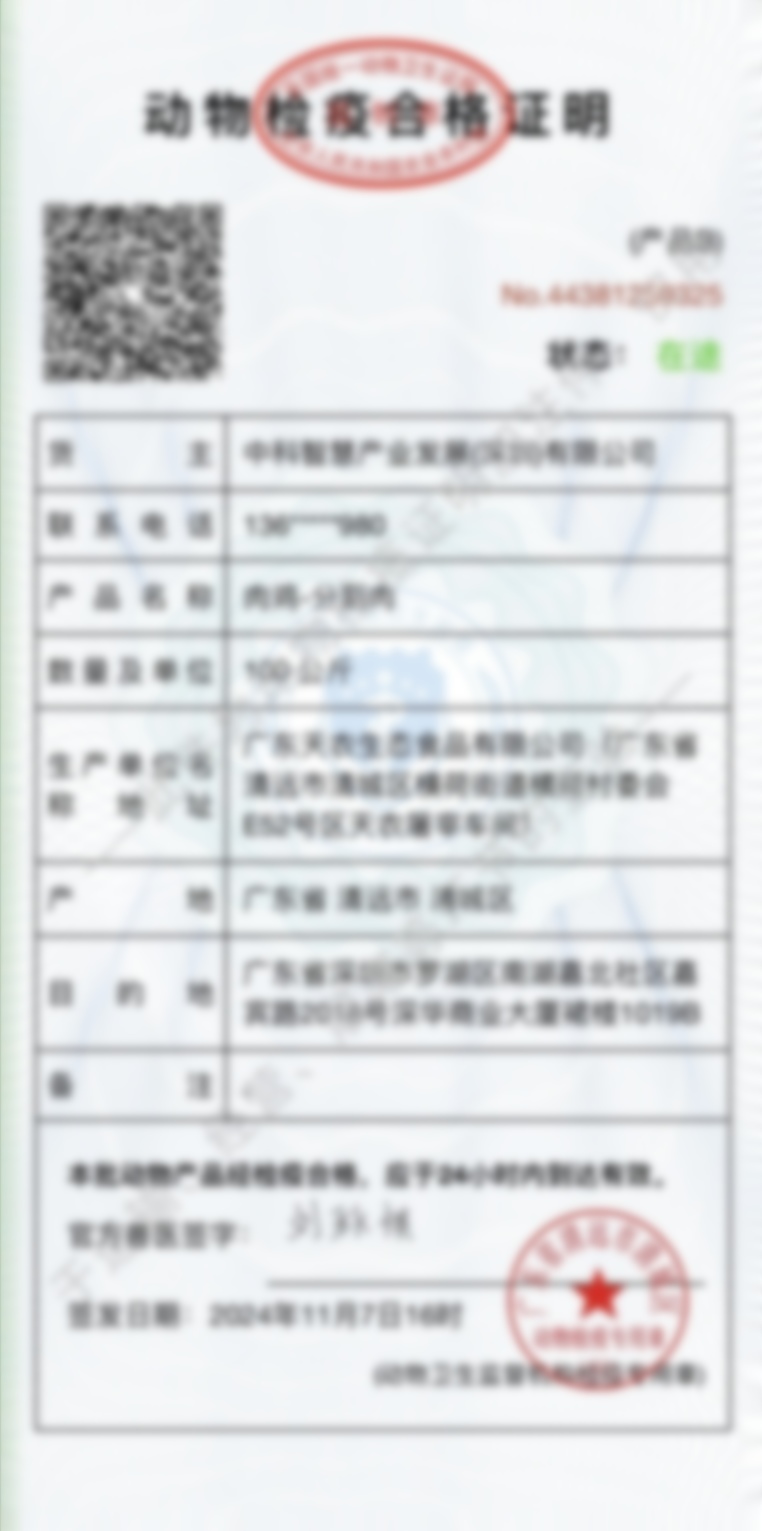 恭喜,您查询的是本公司正品! 您查询的防伪码是:oH0hN0gM4cX1eU8xT2zC4jD6qL8pI1gL 防伪码所属商品:天农乌鸡 所属经销商:中科智慧产业发展(深圳)有限公司 屠宰场:天农横荷供港工厂 原种场:国家级清远麻鸡保种场 种禽场:天农良种繁育中心 孵化场:天农良种繁育中心 养殖基地:云岭养殖基地 执行标准:GB2707-2016鲜(冻)畜禽产品 生长天龄:120天以上 喂料食谱:谷物精制粮 生产日期:2024年11月07日