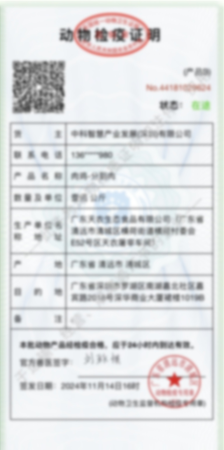 恭喜,您查询的是本公司正品!您查询的防伪码是:rO4wI9tF7wH6tO9xW5mR9vJ4iA6aX8oK防伪码所属商品:天农原种清远鸡所属经销商:中科智慧产业发展(深圳)有限公司屠宰场:天农横荷供港工厂原种场:国家级清远麻鸡保种场种禽场:天农良种繁育中心孵化场:天农良种繁育中心养殖基地:云岭养殖基地执行标准:GB2707-2016鲜(冻)畜禽产品生长天龄:138天以上喂料食谱:谷物精制粮生产日期:2024年11月14日